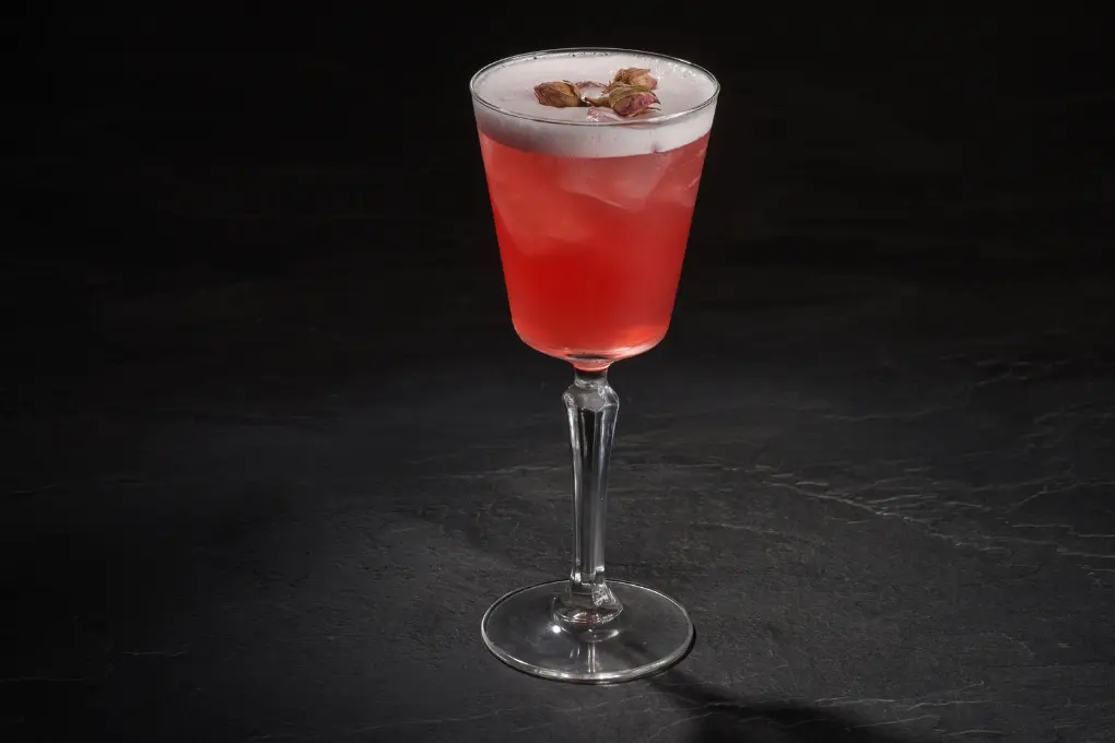 קוקטייל ארומטי, מתוק בעל חמיצות עדינה, על בסיס וודקה, עם תותים, ליצ'י, שקדים, מי וורדים, חמוציות ולימון